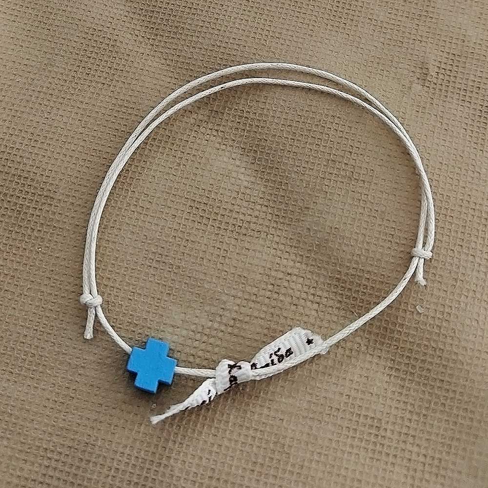 Μαρτυρικό ιβουάρ βραχιολάκι με γαλάζιο ξύλινο σταυρό και κορδελάκι “υγεία-τύχη”