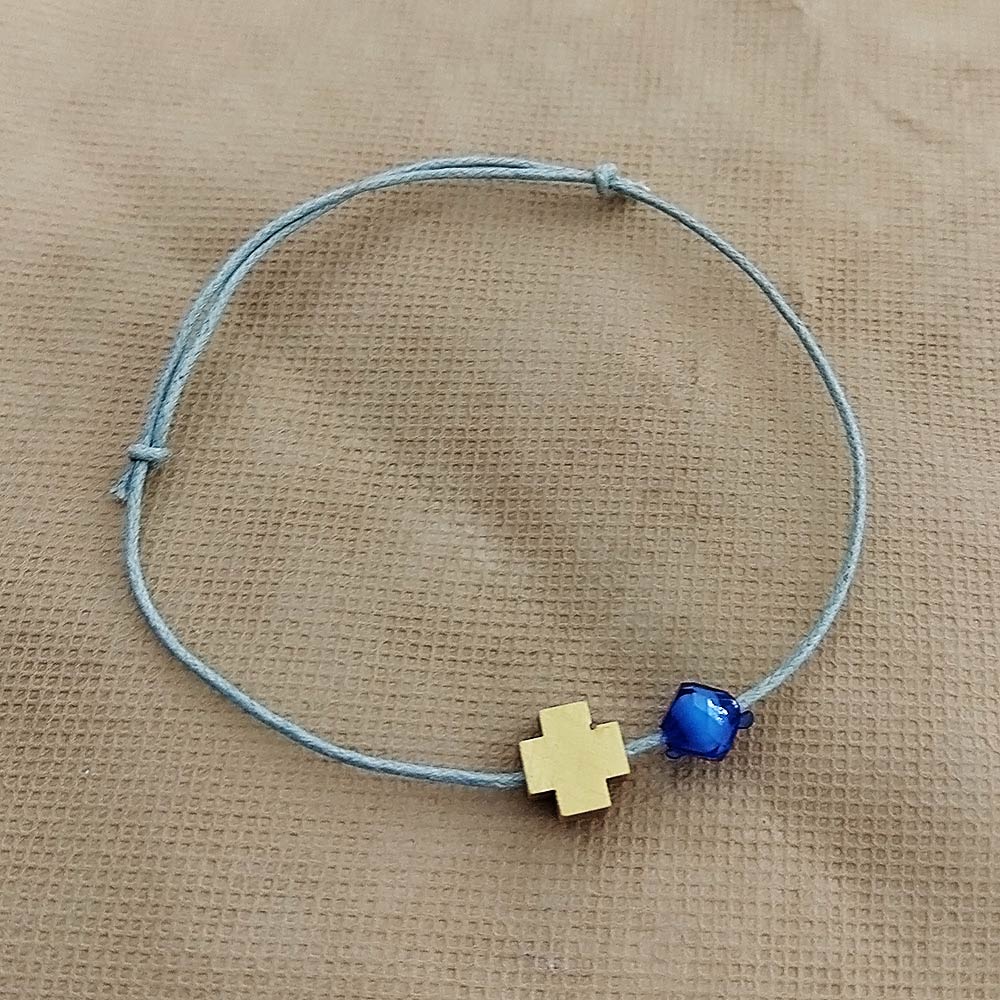 Μαρτυρικό γαλάζιο βραχιολάκι με ξύλινο σταυρό και μπλε μπίλια