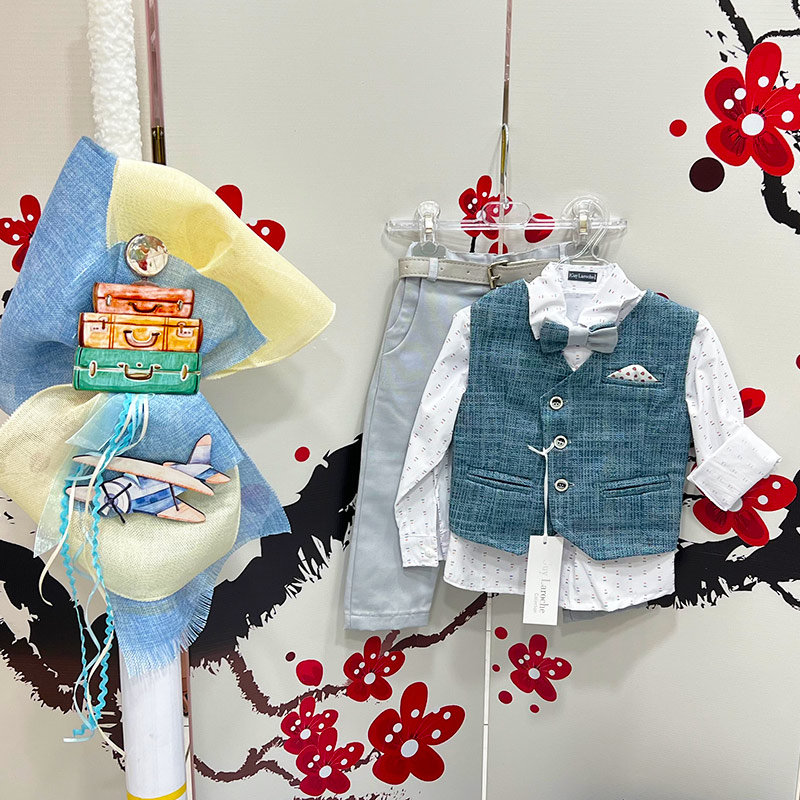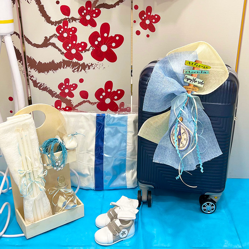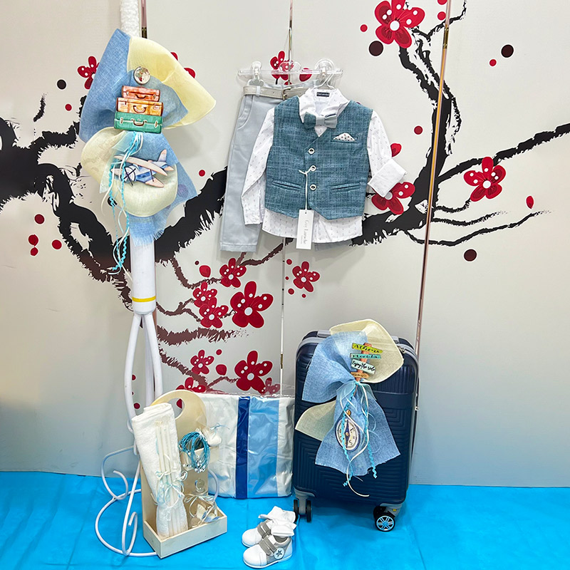 Περιέχει τροχήλατη βαλίτσα, κοστούμι Guy Laroche 75€, παπούτσια δερμάτινα, λαμπάδα, σετ λαδόπανα (λαδοεσώρουχα,πετσέτα,λαδόπανα), σετ λαδιού (3 κεράκια, μπουκάλι, σαπούνι, πετσέτα του παππά), 50 μαρτυρικά (τεμάχια) και καλτσάκια.